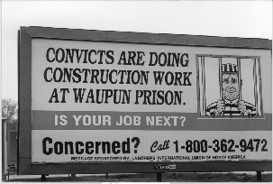 Billboards tell the story of construction workers losing jobs to convicts and raises the question of who's job is next, as the state Department of Corrections tries to keep prisoners "busy." |